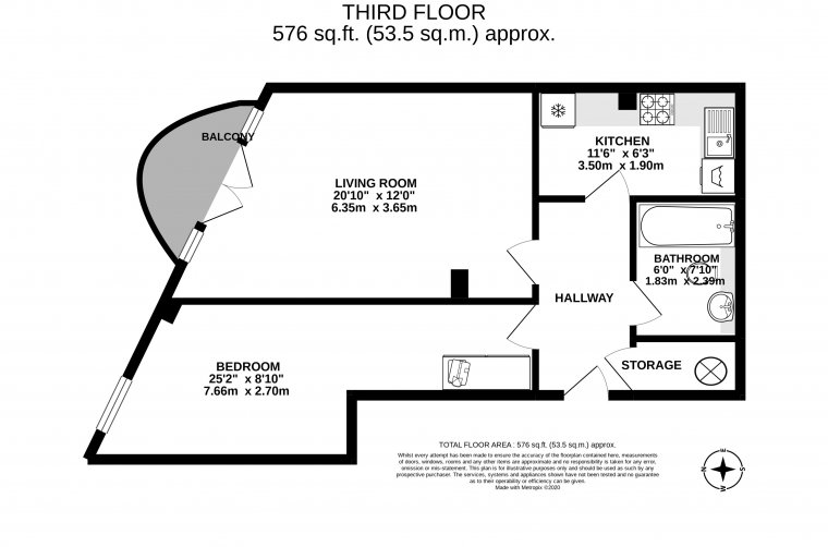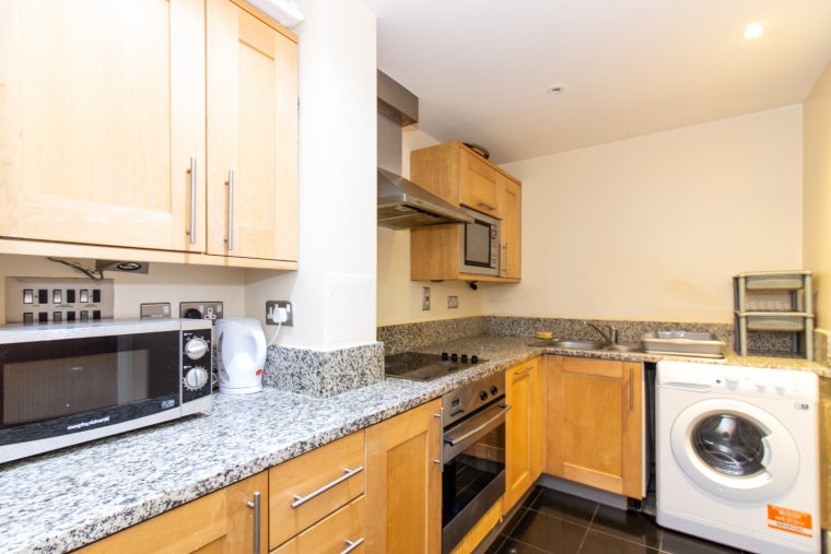 Located on the third floor, the property offers a well-proportioned living and dining area that opens onto a private balcony, a separate fully fitted kitchen, a generous double bedroom with built-in wardrobes, and a modern bathroom.