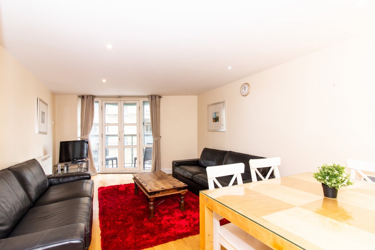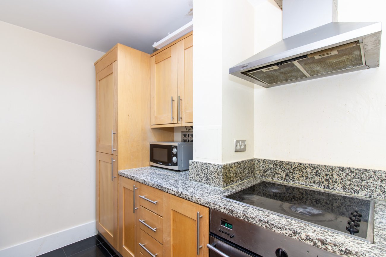 Located on the third floor, the property offers a well-proportioned living and dining area that opens onto a private balcony, a separate fully fitted kitchen, a generous double bedroom with built-in wardrobes, and a modern bathroom.
